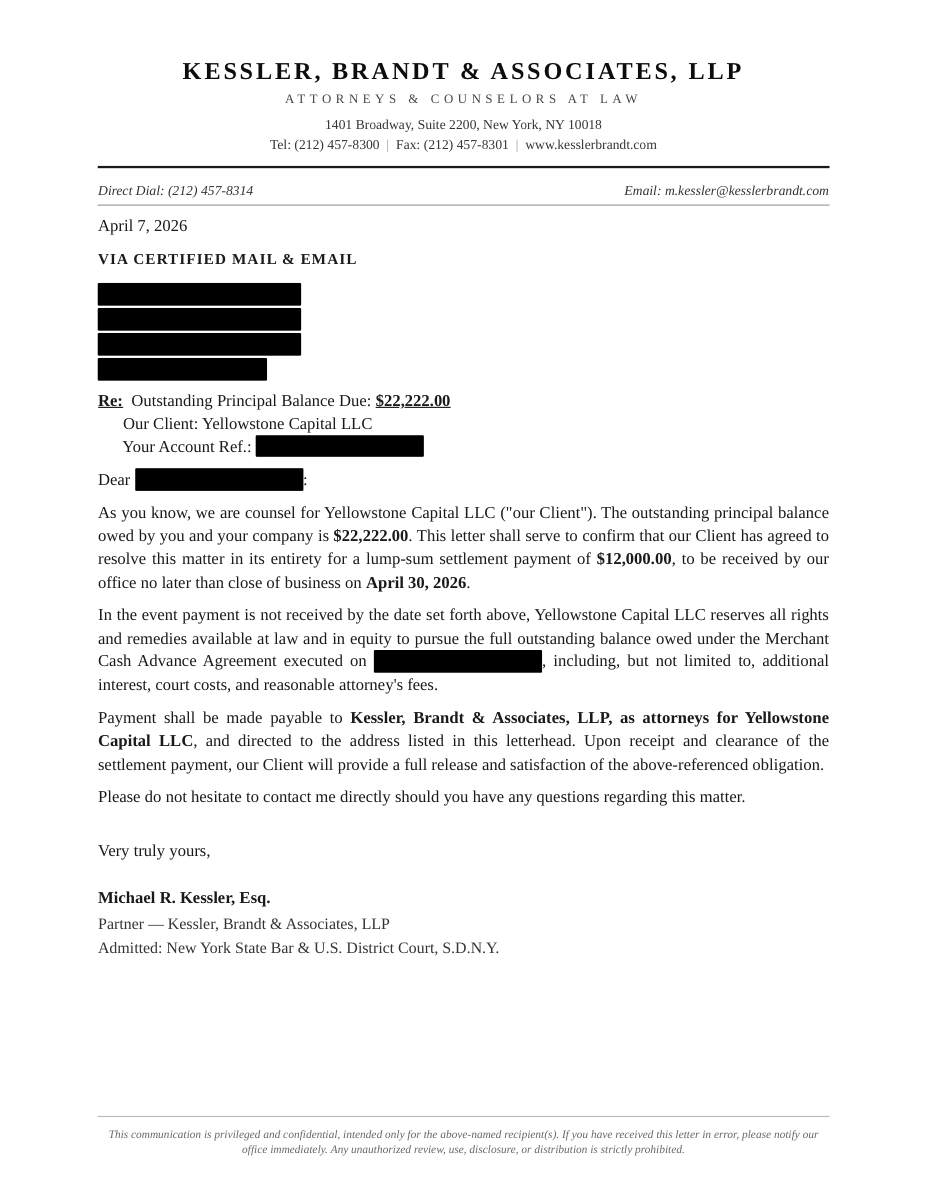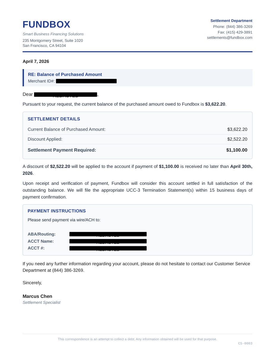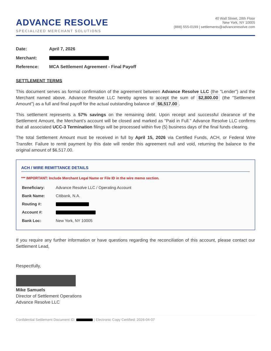 We are a company that specializes in negotiating down our client's debts. We are usually able to restructure or settle your Merchant Cash Advance debt (and other business debt) for significantly reduced sums.